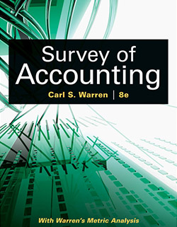 Gain a solid overview of the basic topics of financial and managerial accounting using a unique Integrated Financial Statement Framework with SURVEY OF ACCOUNTING, 8E — written specifically for readers who have no prior knowledge of accounting. The book’s unique framework illustrates the impact of transactions on financial statements without the use of detailed rules and procedures involving debits and credits. This edition also incorporates Warren’s Metric Analysis to link transactions and management decisions to metrics that assess the financial condition and performance of businesses – demonstrating the impact of transactions and management decisions on the business.
